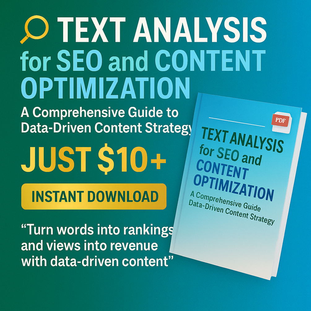 Master the art of SEO and content creation with Text Analysis for SEO and Content Optimization: A Comprehensive Guide to Data-Driven Content Strategy, the definitive PDF guide to crafting high-ranking, engaging content for websites, YouTube, TikTok, Instagram Reels, and more. This power-packed blueprint combines cutting-edge text analysis, AI tools, and proven SEO strategies to boost organic traffic, maximize engagement, and drive revenue. Perfect for bloggers, YouTubers, marketers, and entrepreneurs ready to conquer search engines and social platforms!